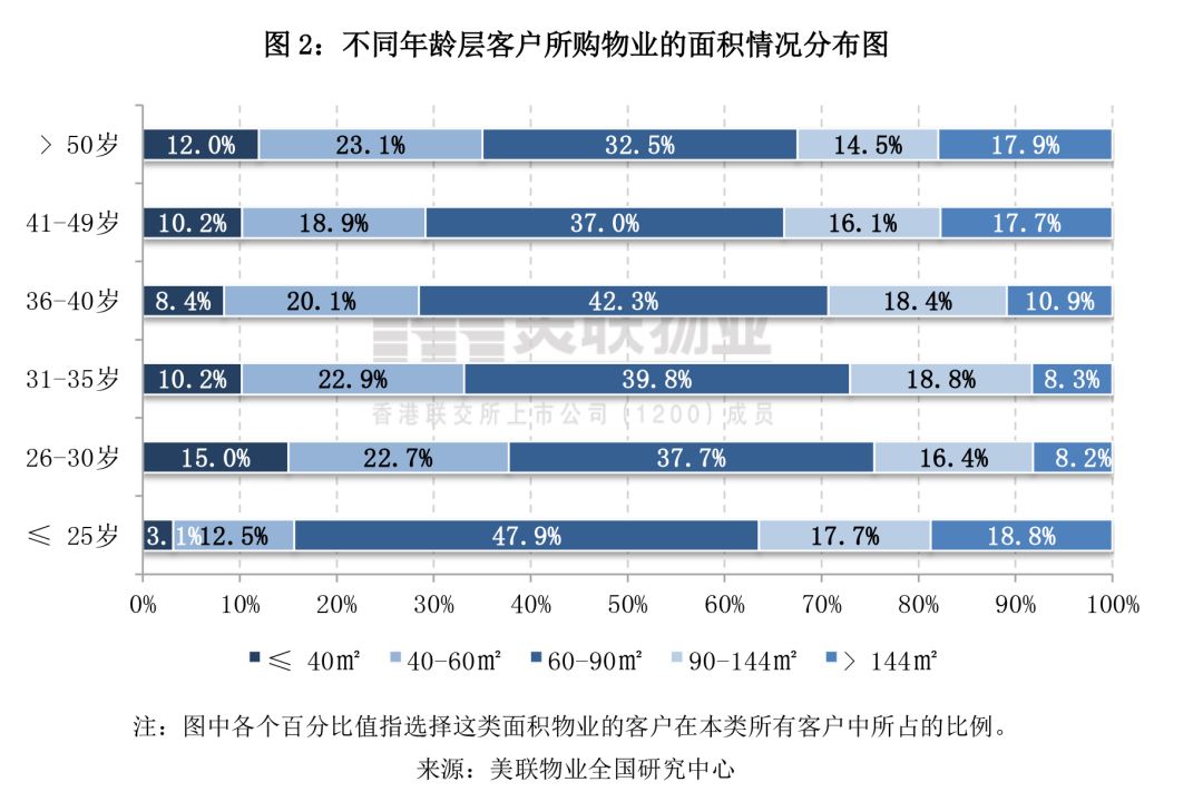 家庭规模推高居住需求,在40岁以上的客户群体中,偏好144㎡以上物业的占比大幅先进于25-40岁的客户。