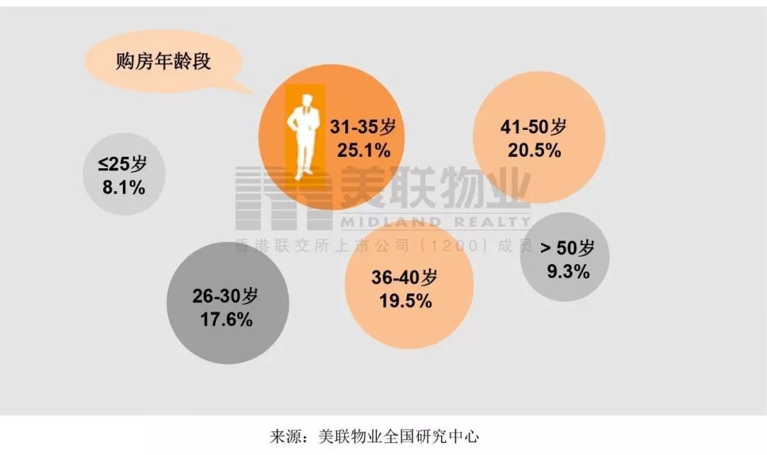 购房者的年龄分布情况与2017年相近,7成以上的购房者年龄在40岁以下,其中31-35岁的客户占25.1%。