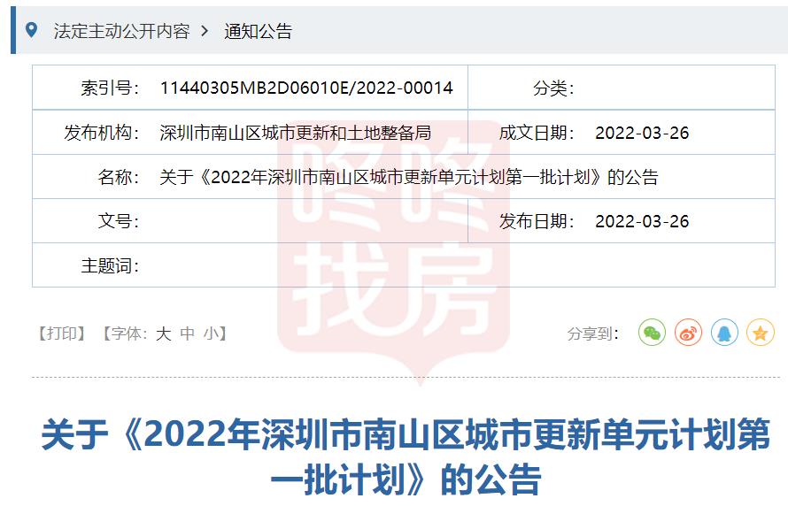 3月26日,南山区城市更新和土地整备局发布《2022年深圳市南山区城市更新单元计划排名前列批计划》。