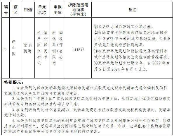 第二批计划公告中包括坪山区龙田街道松泽产业园城市更新单元,申报主体是松泽化妆品(深圳)有限公司,拆除范围用地面积为144513平方米,拟更新方向为普通工业等功能。拆除重建用地范围内应落实用地面积不小于21677平方米的城市基础设施、公共服务设施用地或经营性用地等。在更新单元规划阶段按规定落实深圳市城市总体规划等相关法定规划的管控要求。更新单元计划有效期2年,自2022年8月5日至2024年8月4日止。