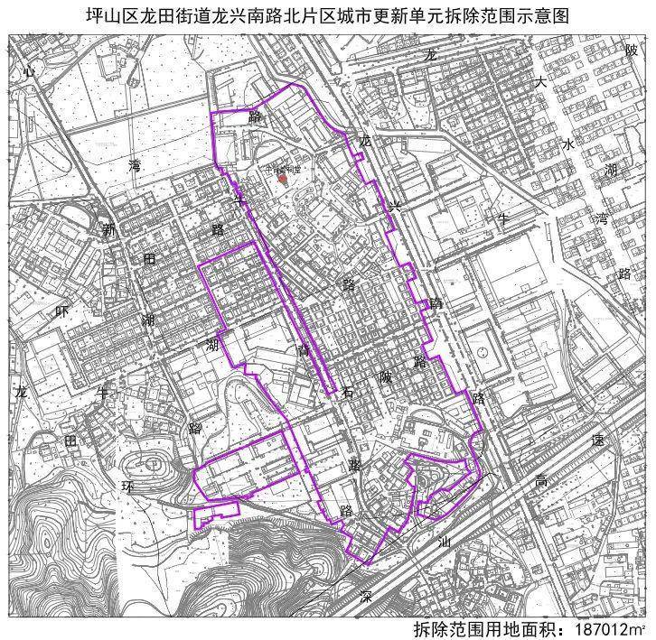 其中,龙兴南路北片区城市更新单元申报主体是深圳市坑梓龙田股份合作公司,拆除范围用地面积187012平方米,拟更新方向为居住等功能。