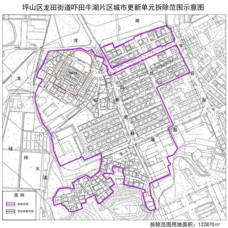 吓田牛湖片区城市更新单元,申报主体是深圳市坑梓龙田股份合作公司,拆除范围用地面积122870平方米,拟更新方向为居住等功能。