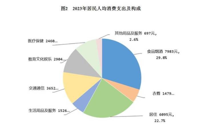 2023年,全国居民人均消费支出26796元,比上年名义增长9.2%,扣除价格因素影响实际增长9.0%。