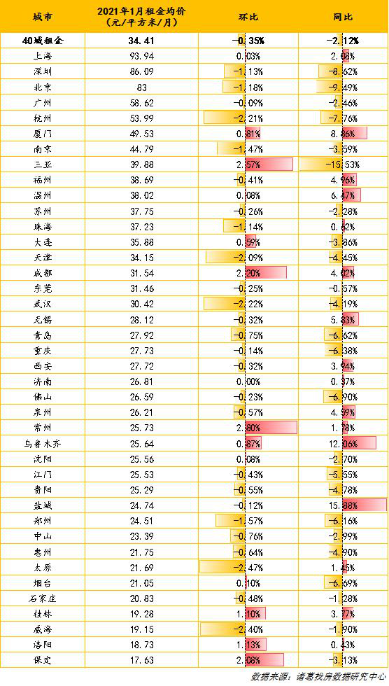 近日,诸葛找房数据研究中心发布《2021年1月全国大中城市租金均价报告》。数据显示,全国大中城市租金挂牌均价为34.41元/平方米/月,环比下降0.35%,同比下降2.12%,环比降幅较上月收窄0.15个百分点。