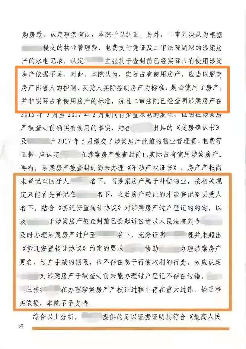 《拆迁安置转让协议书》合法有效,郑某出具的《收款收据》属于对客户通过刘某付款行为的追认,应认定为客户在涉案房产被查封之前已按约定支付了全部购房款,实际占有物业应当以脱离房产出售人的控制、买受人实际控制房产为标注,是否使用了房产,并非实际占有使用房产的标准,二审查明的少量水电费发生,证明查封前确有使用的事实,结合郑某出具的《交房确认书》及客户2017年5月缴交的物业费、水电费等证据,应认定客户于查封前已经实际占有使用涉案房屋。