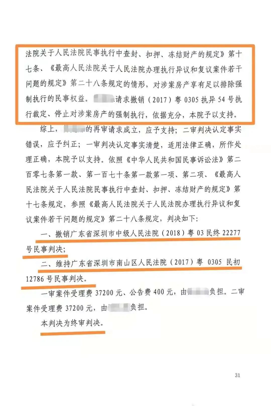 2021年1月29日,再审判决:撤销深圳市中级人民法院二审判决,维持深圳市南山区人民法院一审判决。(ps:此时单价已近20万,总价已过2000万~~~)