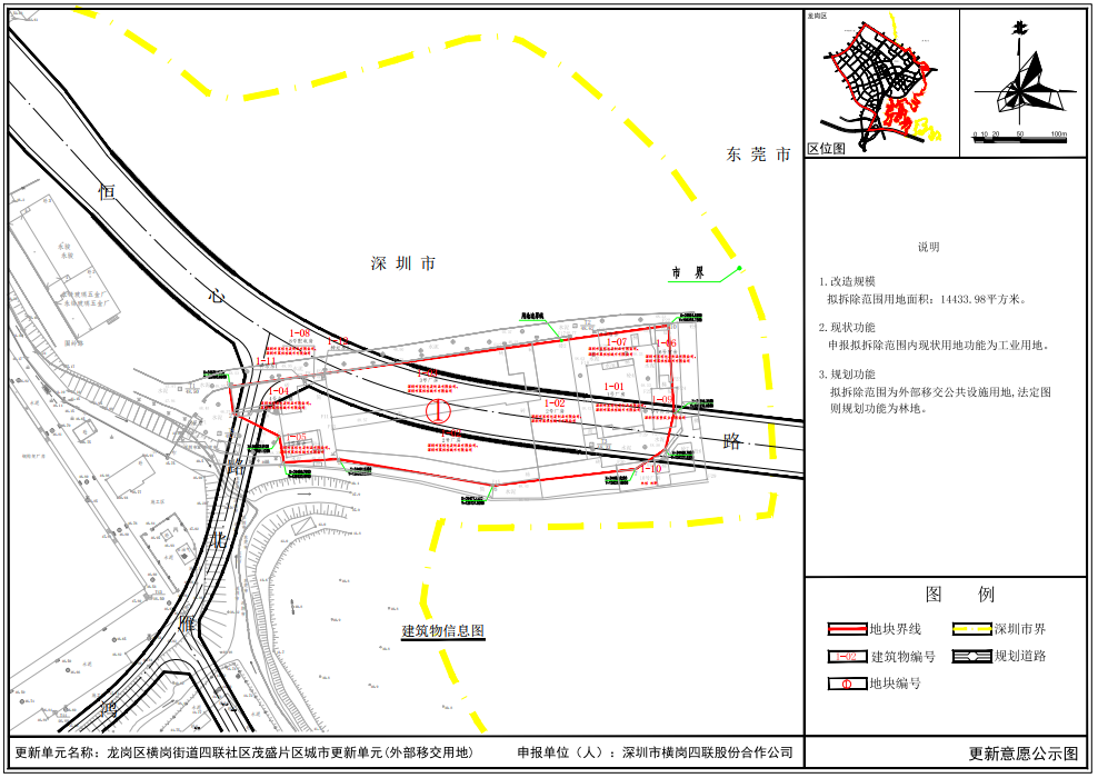 龙岗区更新整备局发布横岗街道四联社区茂盛片区城市更新单元外部移交用地意愿公示。
