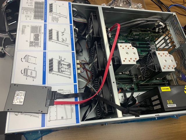 阿森向记者展示了一台正在组装的用于奇亚币挖矿的服务器。在长方体的外壳内,放置了CPU、两个固态硬盘以及硬盘柜,而这台服务器的硬盘柜内可以放置24个16T的移动硬盘,一起组合成384T的超大硬盘。