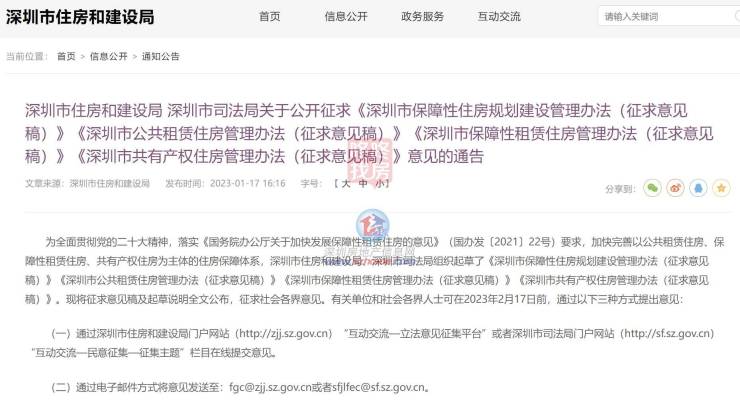 1月17日,深圳市住房和建设局、深圳市司法局发布《深圳市保障性住房规划建设管理办法(征求意见稿)》《深圳市公共租赁住房管理办法(征求意见稿)》《深圳市保障性租赁住房管理办法(征求意见稿)》《深圳市共有产权住房管理办法(征求意见稿)》,公开征求意见。