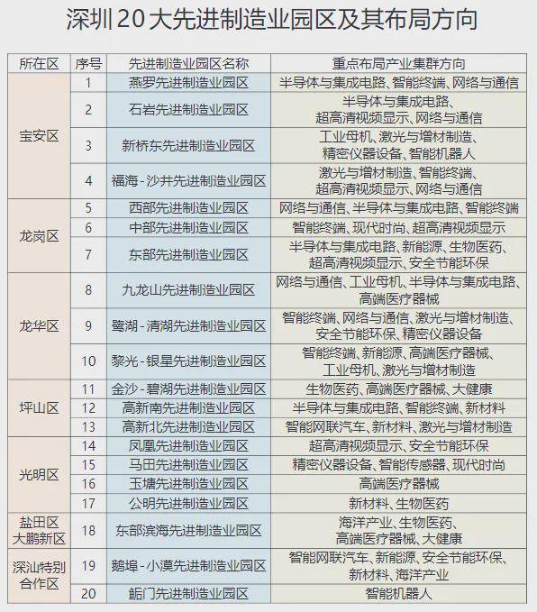 2022年深圳发布了《深圳市20大先进制造业园区空间布局规划》,其中明确提到未来重点布局的产业:
