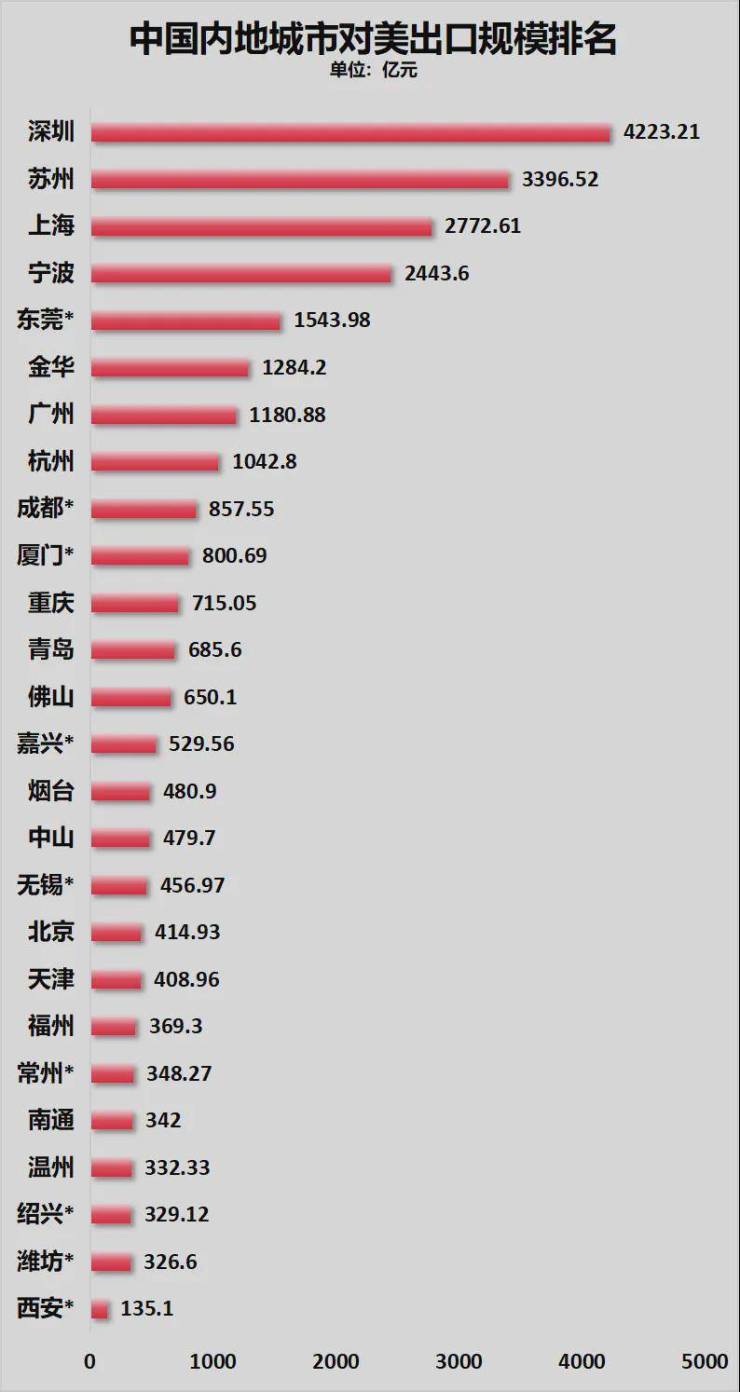 苏州对美出口超过3000亿,上海、宁波超过2000亿。