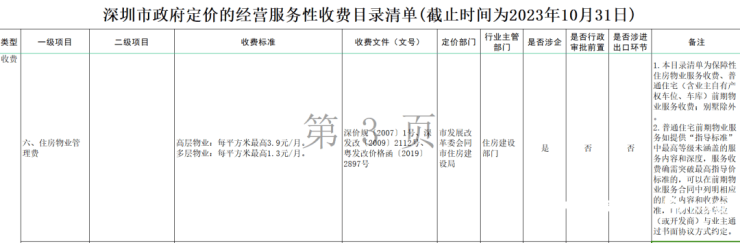 除此之外,袁女士还表示,根据深圳市发展和改革委员会今年11月8日发布的“关于修订更新深圳市政府定价的经营服务性收费目录清单的公告”,在“住房物业管理费”项目一栏,收费标准为“高层物业:每平方米最高3.9元/月。多层物业:每平方米最高1.3元/月。”其认为,小区物业此举或涉嫌与该文件相违背。