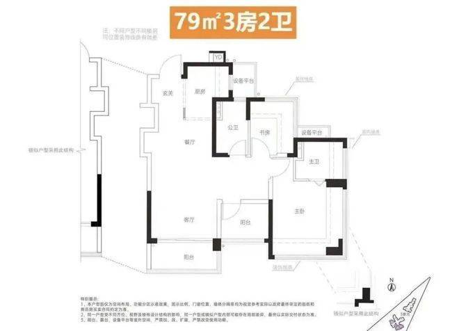 建面约78-84㎡ 3房2卫:主力户型。其中约84㎡户型做到了横厅南北通透,这在同面积段产品中极为罕见,极大地提升了居住舒适度。