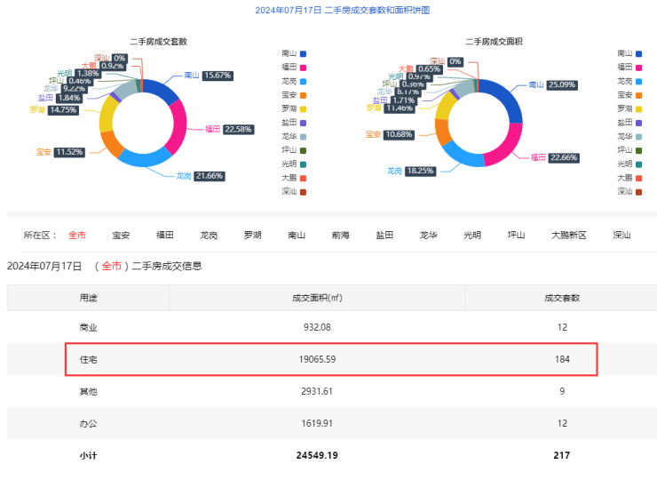 2024年7月17日二手房住宅网签184套。宝安23套;福田32套;龙岗43套;罗湖29套;南山29套;盐田3套;龙华20套;光明2套;坪山1套;大鹏2套。