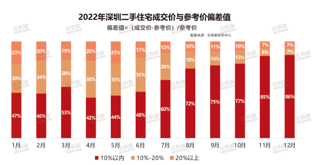 据乐有家研究中心统计,到2022年12月近9成二手房房源成交价接近参考价较上半年有大幅提升,购房成本明显减少。