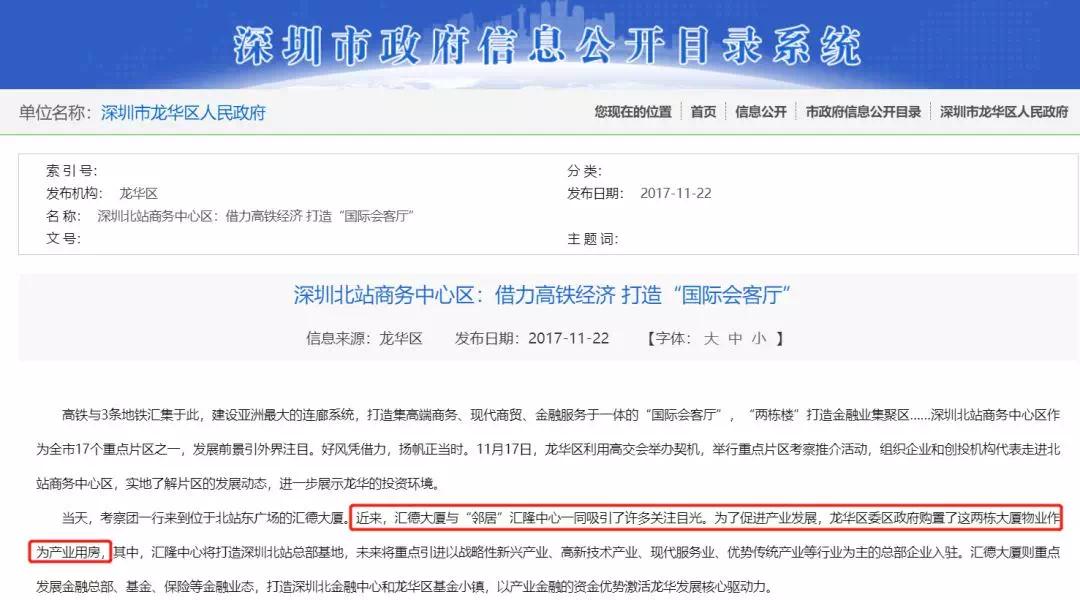 关键是,这些超高办公楼并不是虚有其表,例如在深圳北站东广场两侧分布的汇隆中心和汇德大厦,都被龙华区委区政府收购了,作为政府促进产业发展的高端产业用房: