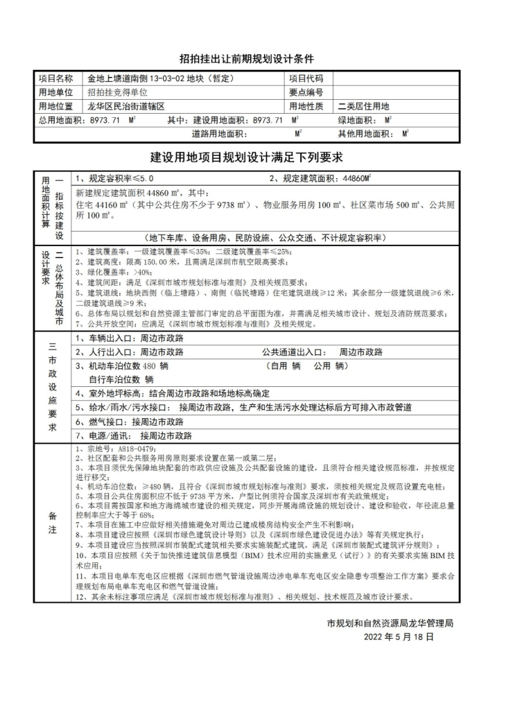 项目占地面积约0.9万㎡,建筑面积约4.5万㎡,其中住宅约4.4万㎡、物业服务用房100㎡、社区菜市场500㎡,整体容积率5.0。