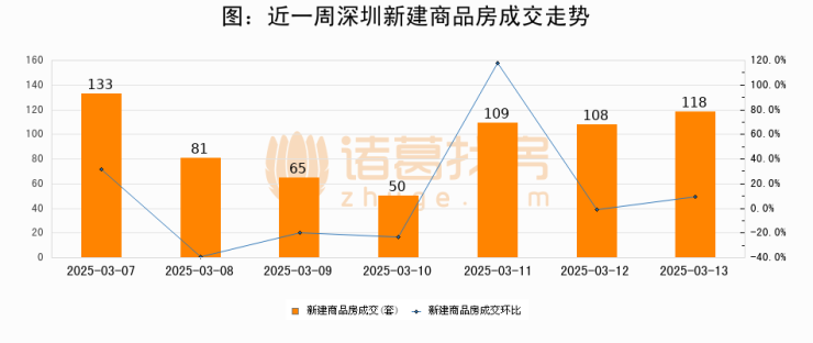 根据深圳市住房和城乡建设局数据显示,2025年03月13日深圳新建商品房成交118套,较昨日增加10套,环比上涨9.3%。近一周深圳新建商品房日均成交95套。03月13日单日成交118套,高于近一周平均水平24.2%。