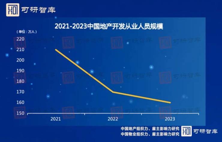 据可研智库测算:2023年中国地产开发从业人员在160万人左右,较2021年峰值210万人来看,2023年有近50万地产开发人员流失。