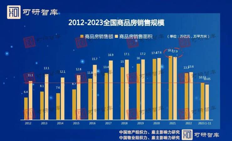 回顾并梳理行业发展脉络,从2012-2023年全国商品房销售规模研究来看,2021年,不但成为中国地产业近十年来经营规模与组织效能峰值表现年;也创造了自1994年城镇住房制度改革以来的历史性顶峰值。