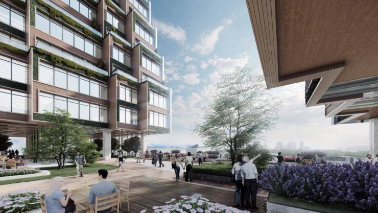 两座塔楼之间由建筑裙楼连城一体,裙楼屋顶自然生成了空中花园,将原本分区的建筑空间,便捷地互通连接。