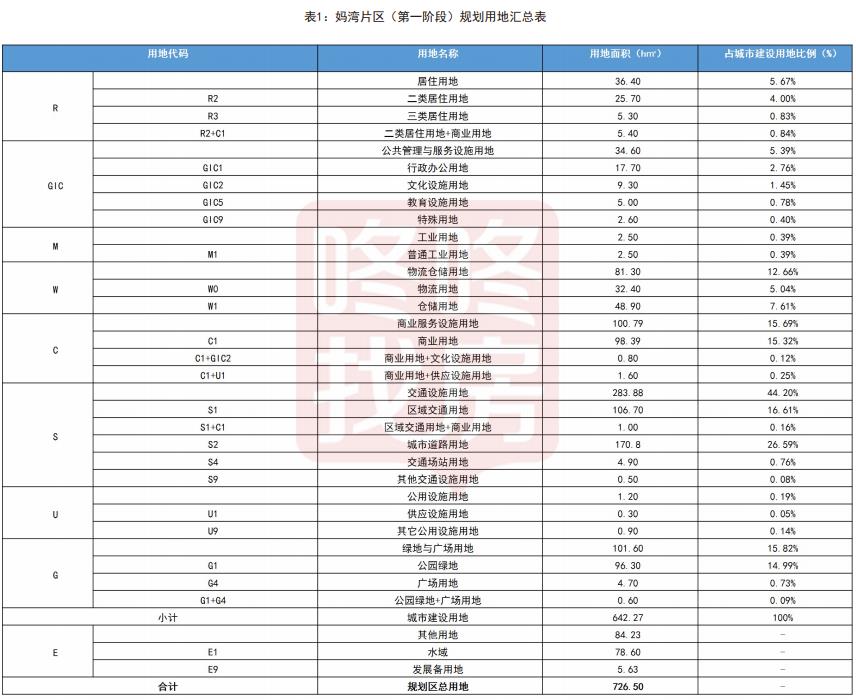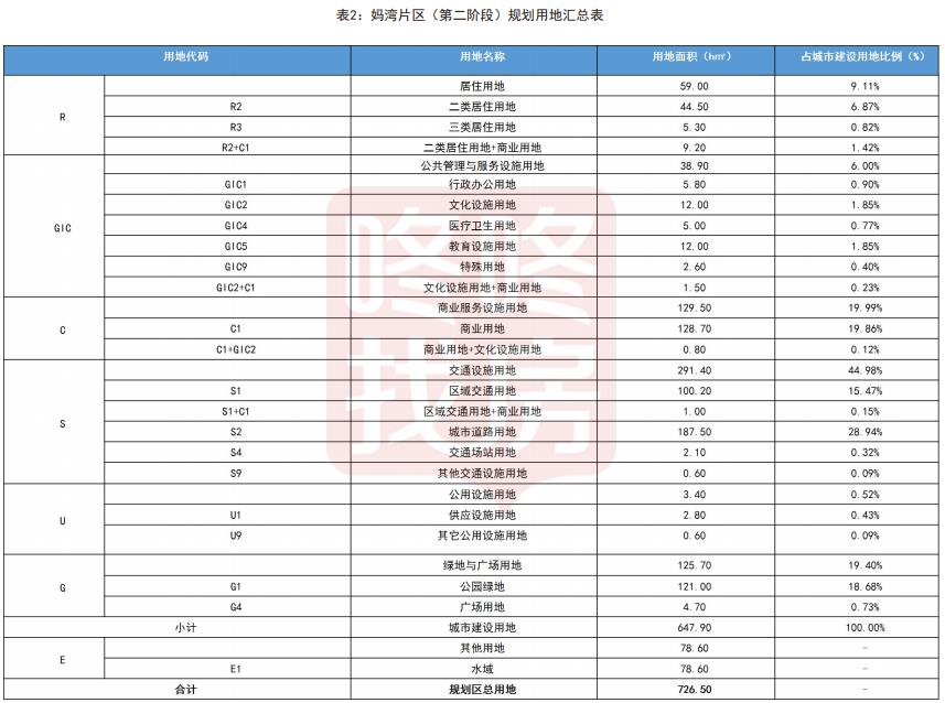 妈湾片区规划用地(第二阶段):总用地面积726.50公顷。其中居住用地59.00公顷,二类居住用地44.50公顷,三类居住用地5.30公顷。