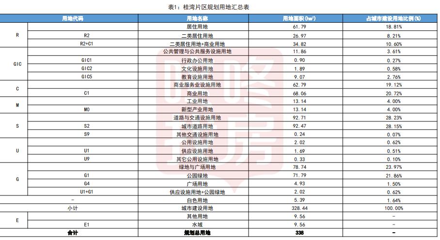 桂湾片区规划用地:总用地面积338公顷。其中居住用地61.79公顷,二类居住用地26.97公顷,二类居住用地+商业用地34.82公顷。