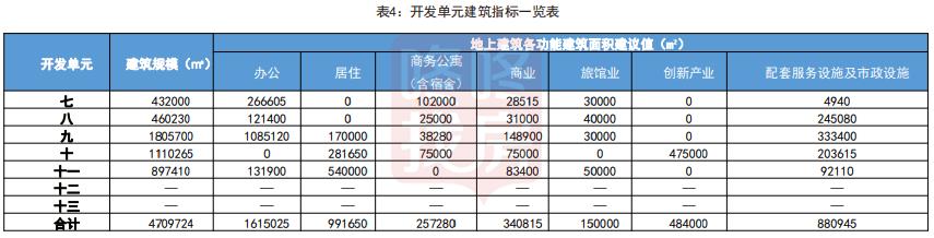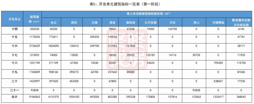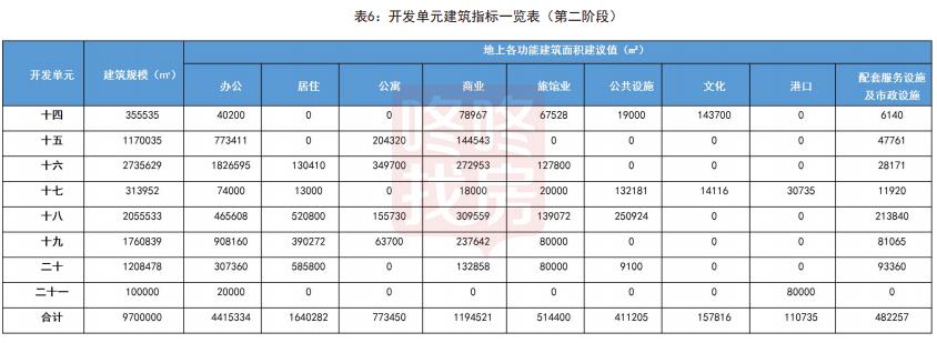 前湾片区七个开发单元中,办公建筑总面积16515025㎡,居住建筑总面积991650㎡,商务公寓建筑总面积257280㎡,商业建筑总面积340815㎡。