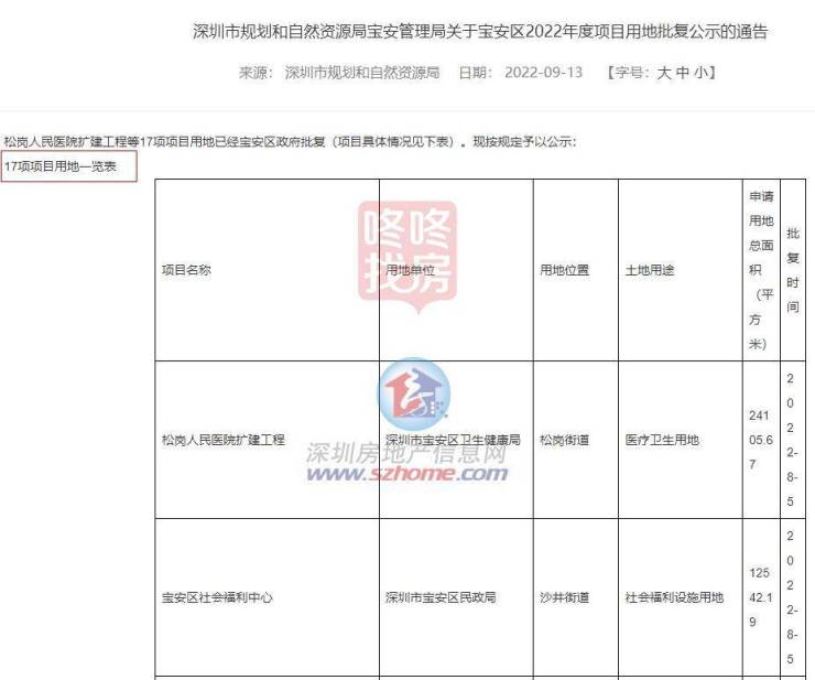 此外,宝安还发布了2022年度项目用地批复的公示,涉及17个项目,主要是以公共项目为主。