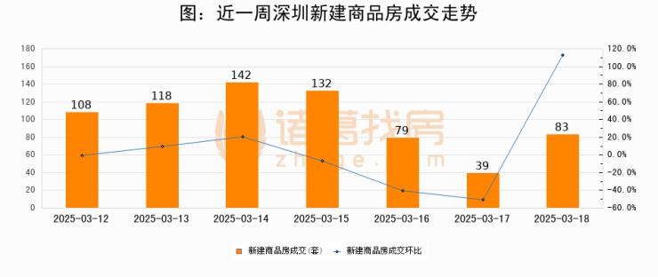 根据深圳市住房和城乡建设局数据显示,2025年03月18日深圳新建商品房成交83套,较昨日增加44套,环比上涨112.8%