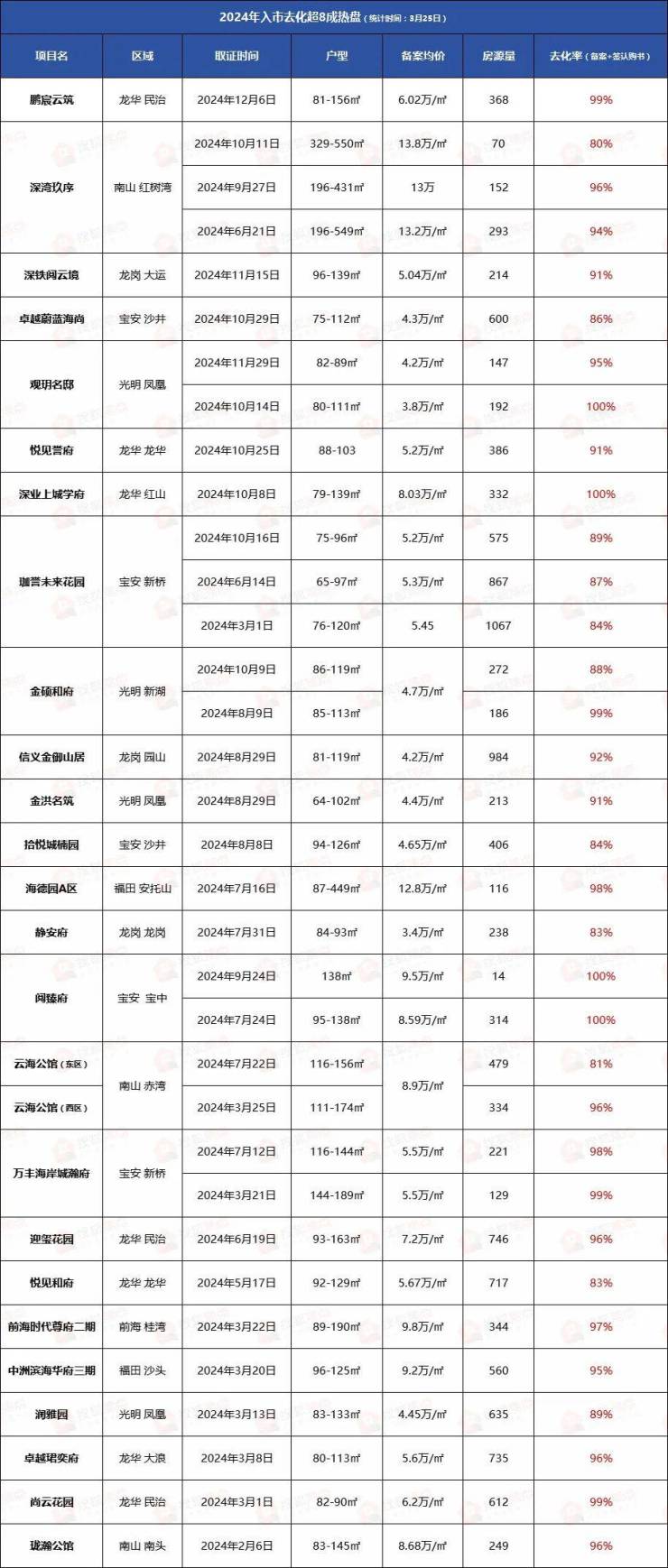 @搜狐焦点深圳 整理2024年至已取证入市的新盘,发现有26盘(34批预售证)的去化率超8成(含已备案+已签认购书)。