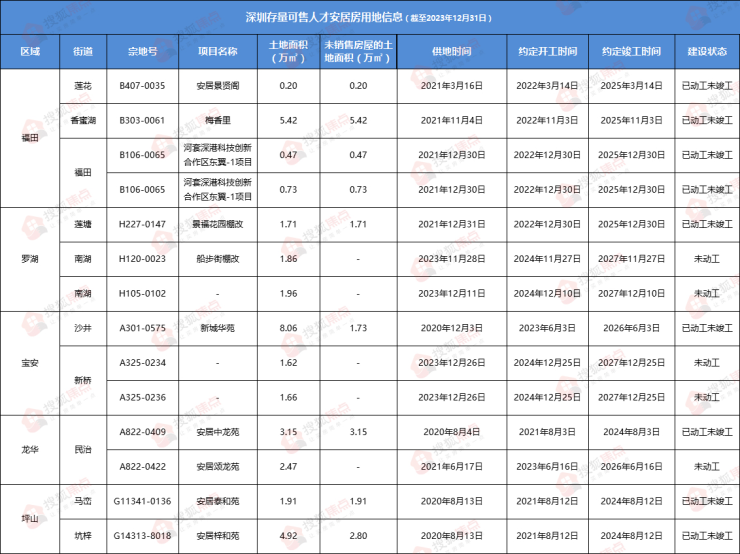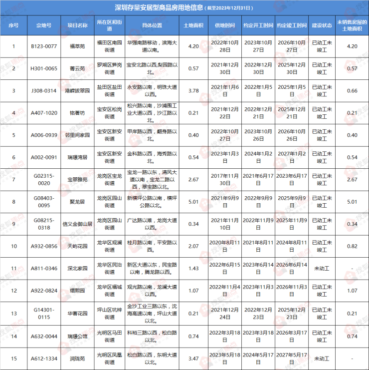 日前,深圳官宣最新存量住宅建设用地项目清单(截至2023年12月31日),公示存量住宅项目602个,存量用地总面积1176.85公顷,未动工土地面积314.57公顷,已动工土地面积862.28公顷,其中,未销售土地面积358.35公顷。