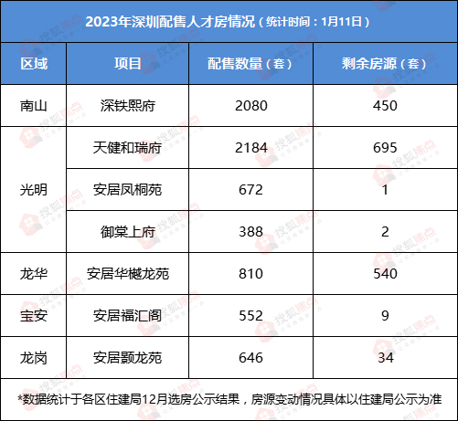 除了上述新盘外,2023年所推的人才房剩余房源预计也会在上半年重新配售(常态化配售),合计约1731套房源。其中,项目自身体量比较大的剩余房源量也相对较多,如深铁熙府、天健和瑞府、安居华樾龙苑三个项目。
