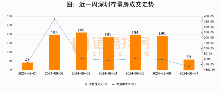 从存量房来看,2024年09月07日深圳存量房单日成交58套,比昨日减少132套,环比下降69.5%。从近一周存量房成交来看,深圳存量房日均成交套数为153套,09月07日单日成交58套,低于近一周平均水平62.1%。