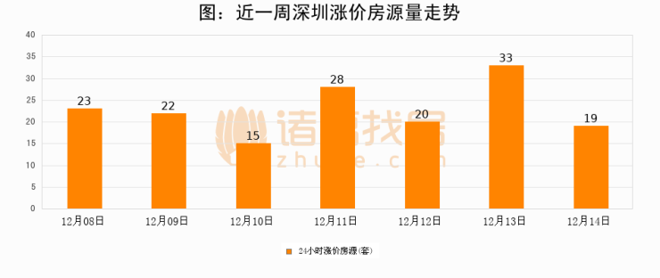 根据诸葛找房数据显示,深圳24小时涨价房源量为19套,较12月13日减少14套,环比下降42.4%。与此同时,涨价房源占比小幅回落,对于购房者来说是一个入市窗口期,购房者可抓住时机入市。