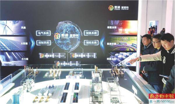 3月26日,2024中国国际氢能及燃料电池产业展览会上,参观者观看氢能源的生产与应用智能模拟沙盘。新华社发