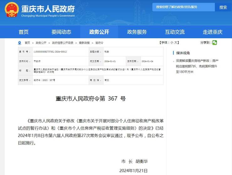 1月24日,重庆发布政府令,发布公布了《重庆市人民政府关于修改〈重庆市关于开展对部分个人住房征收房产税改革试点的暂行办法〉和〈重庆市个人住房房产税征收管理实施细则〉的决定》,其中提到,建筑面积未超过180平方米的高档住房无需再缴房产税。