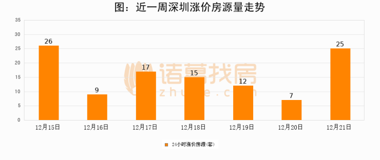 根据诸葛找房数据显示,深圳24小时涨价房源量为25套,较12月20日增加18套,环比上涨257.1%。与此同时,涨价房源占比小幅扩大,业主信心有所提升。