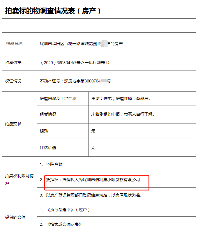 该房屋的抵押权人为深圳市信利康小额贷款有限公司,因与被执行人个人和公司小额借款合同纠纷一案中,依法立案执行。