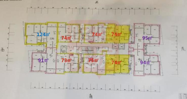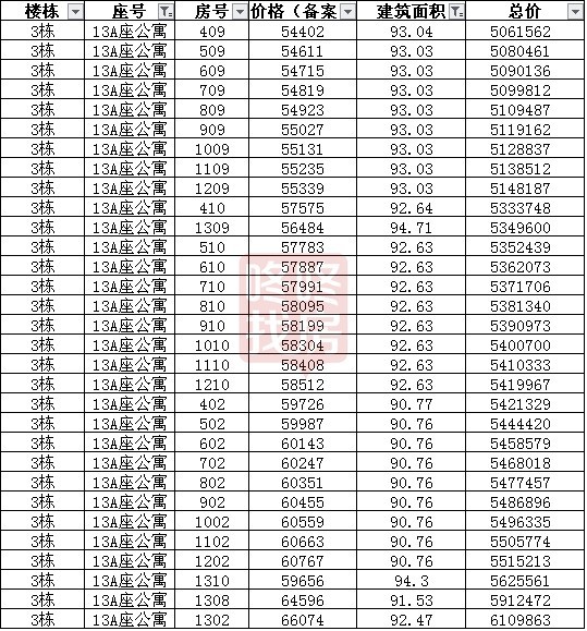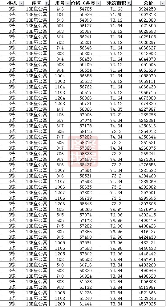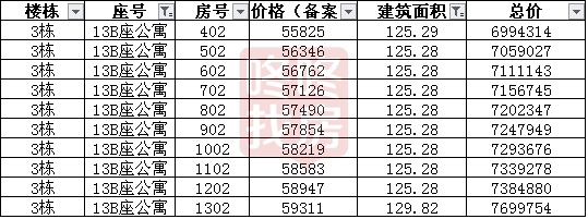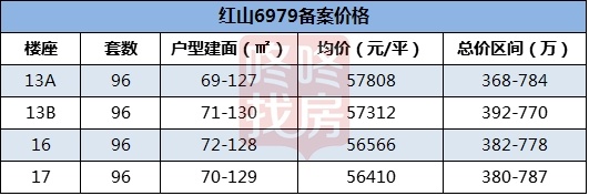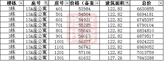 4座公寓每座96套,主要分为三个区间段的面积,13A主要为69-78平54套 、90-95平32套、122-127平10套,均价为57808元/平,是所有楼座中备案均价较高的,总价区间为368-784万,按照户型面积总价从低到高排名如下: