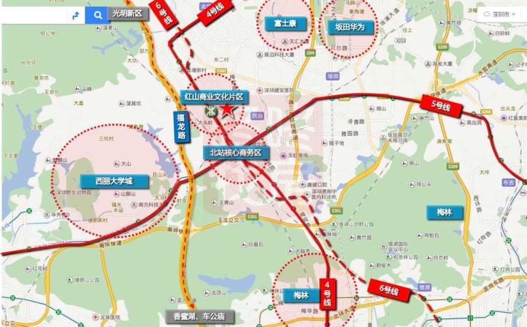 红山片区紧邻龙华区重点规划的深圳北站商务区域,规划总建面997万平米,主要发展总部经济、产业金融服务及综合商业。该片区将兴建60多栋甲级写字楼,打造深圳北城市中心区。