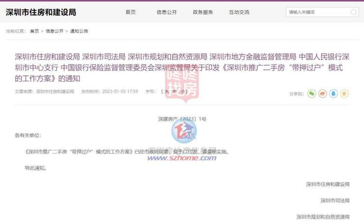 1月5日,深圳市住房和建设局等六部门联合发布《深圳市推广二手房“带押过户”模式的工作方案》的通知(以下简称《方案 》)。