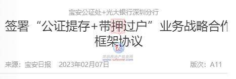 今日(2月7日),据宝安日报消息,日前,宝安公证处和中国光大银行股份有限公司深圳分行举行二手房交易“公证提存+带押过户”业务战略合作框架协议的签署仪式。