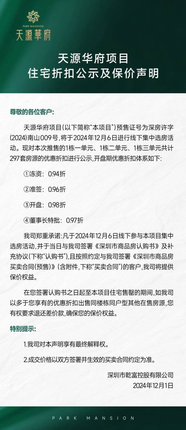 折合约86折!南山天源华府开盘折扣、保价声明曝光,12月6日正式开盘