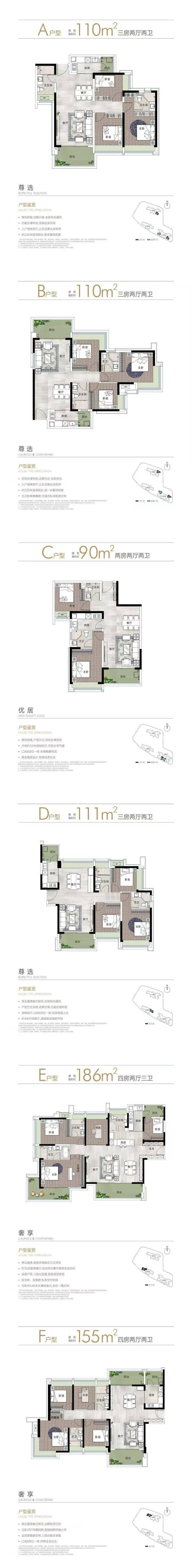 可售商品住宅297户将在本批次全部推出,面积段包含建面约90-110-111-126-155-186㎡2-4房。