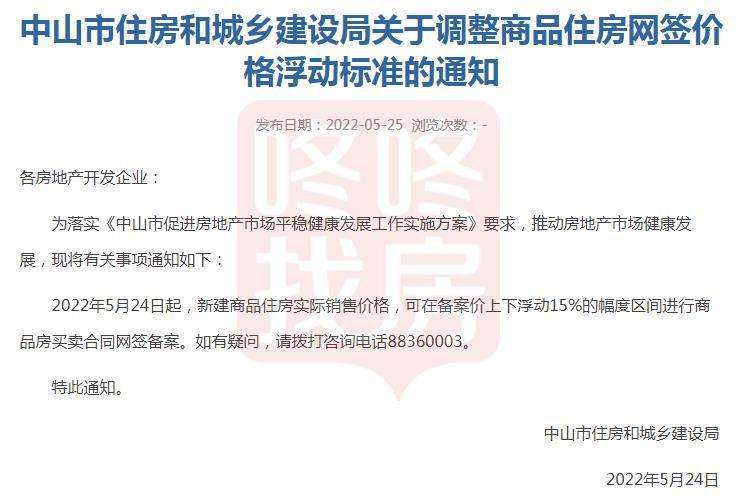 5月25日,中山住建局发布《关于调整商品住房网签价格浮动标准的通知》。