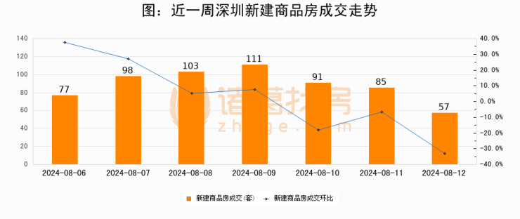 根据深圳市住房和城乡建设局数据显示,2024年08月12日深圳新建商品房成交57套,较昨日减少28套,环比下降32.9%。近一周深圳新建商品房日均成交89套。08月12日单日成交57套,低于近一周平均水平36%。