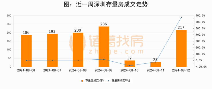 从存量房来看,2024年08月12日深圳存量房单日成交217套,比昨日增加189套,环比上涨675%。从近一周存量房成交来看,深圳存量房日均成交套数为156套,08月12日单日成交217套,高于近一周平均水平39.1%。