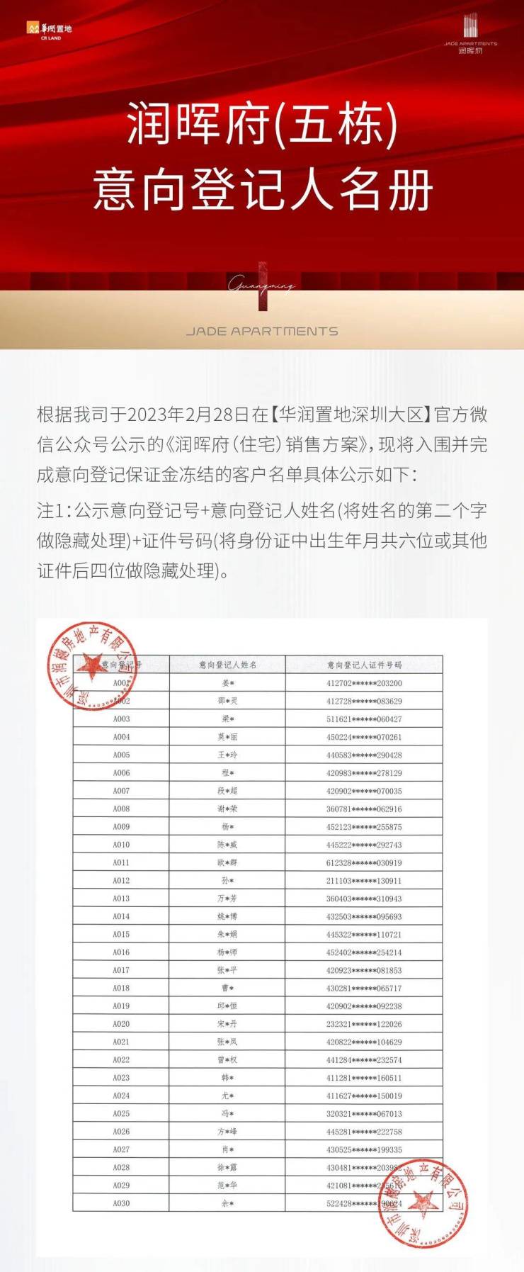 今日(3月2日)11:00,华润润晖府(五栋)在前海公证处公证摇号,共登记52批客户。