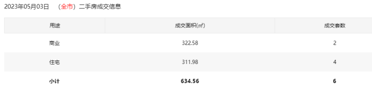 5月3日二手房住宅网签4套。宝安2套;福田1套;龙岗0套;罗湖1套;南山0套;盐田0套;龙华0套;光明0套;坪山0套;大鹏0套。